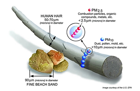 These particles are a tiny fraction of the diameter of a human hair, and much, much smaller than a grain of sand. Research is continuing to determine how the size of and different compounds in these particles affect human health.